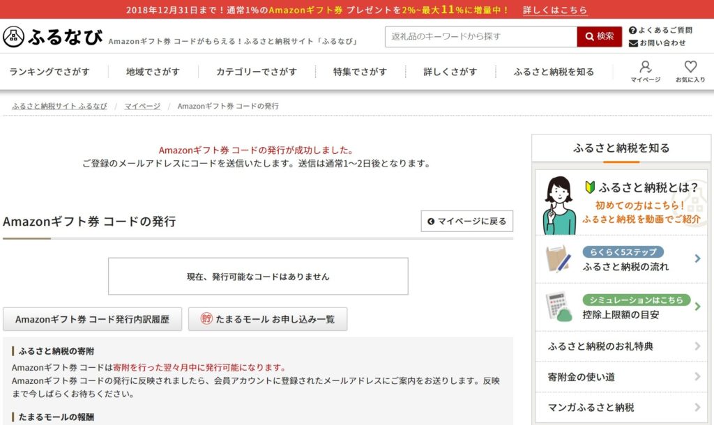 「ふるなび」のサイトでついてくる Amazonギフト券 1%もようやく届きましたー。