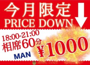 2019年3月末まで、茶屋町店限定で、相席料金 1,000円キャンペーンしてます。(17時から20時まで)
