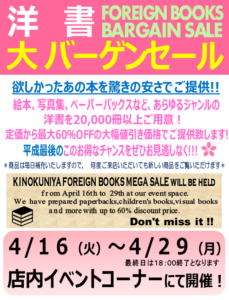 洋書ファンにはお馴染み、紀伊國屋書店とっておきの洋書大バーゲンセールを今年も開催されます。