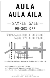 東京 AULA / AULA AILA Sample Sale開催 2019年5月30-31日