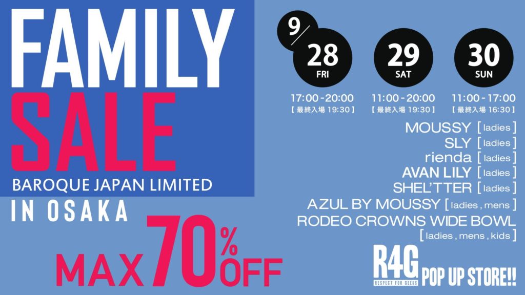 大阪 「バロックジャパンリミテッド ファミリーセール」開催2018年9月28-30日