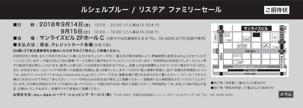 大阪「ルシェルブルー リステア ファミリーセール」開催2018年9月14-15日