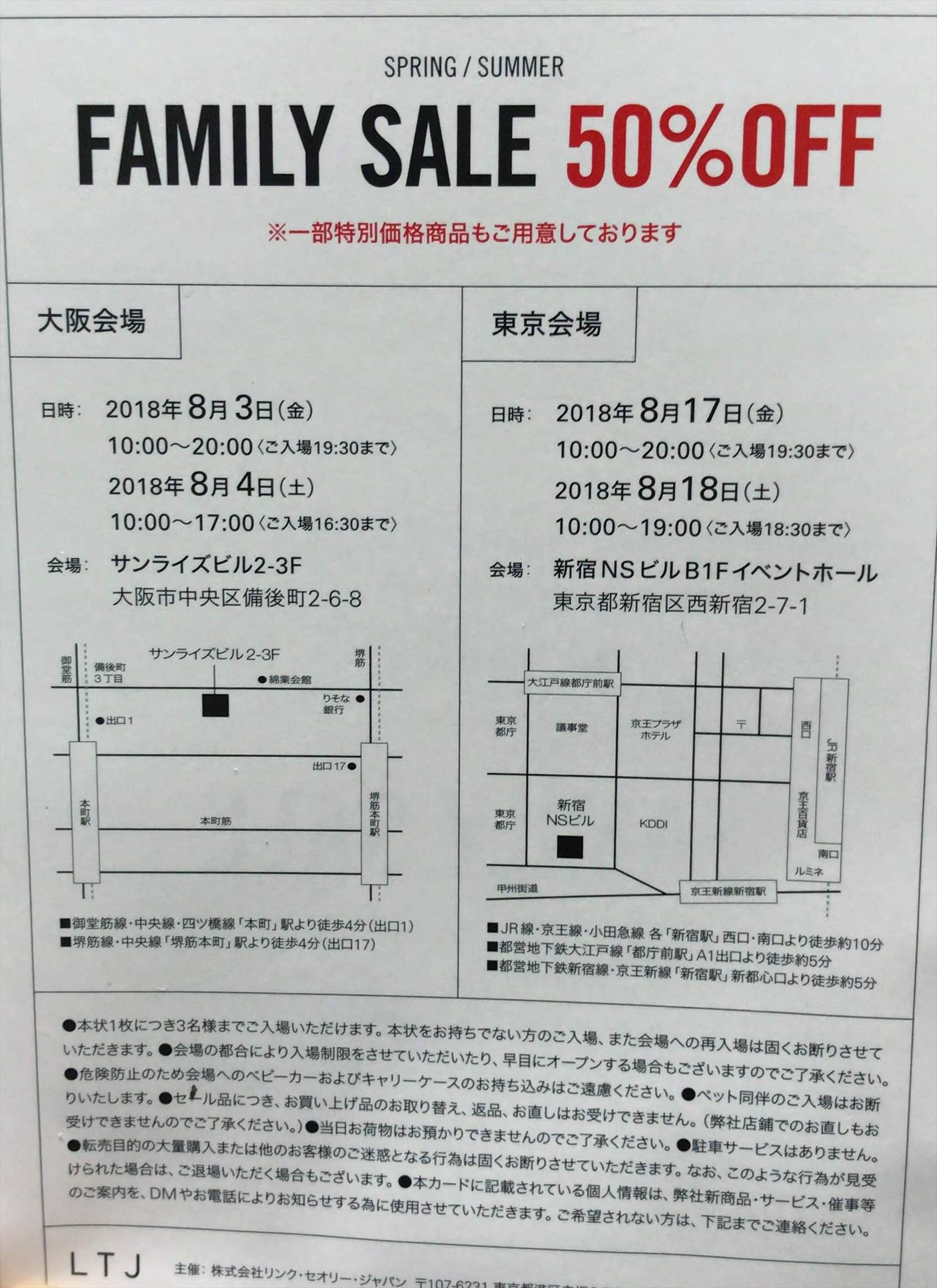 リンク・セオリーグループの2018年8月開催のファミリーセールのインビテーションが届きました。