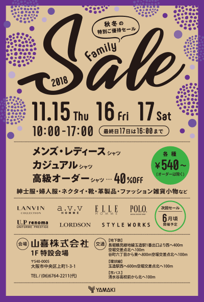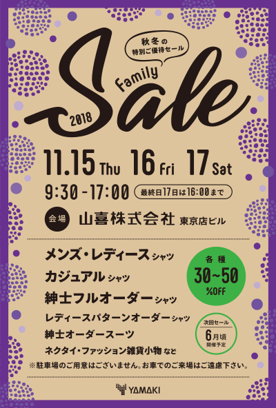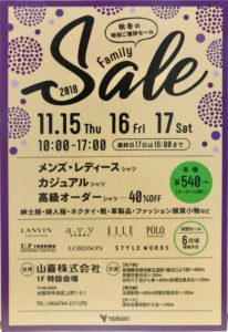 11月15日(木)より、老舗シャツメーカー 山喜株式会社のファミリーセールが開催されます。