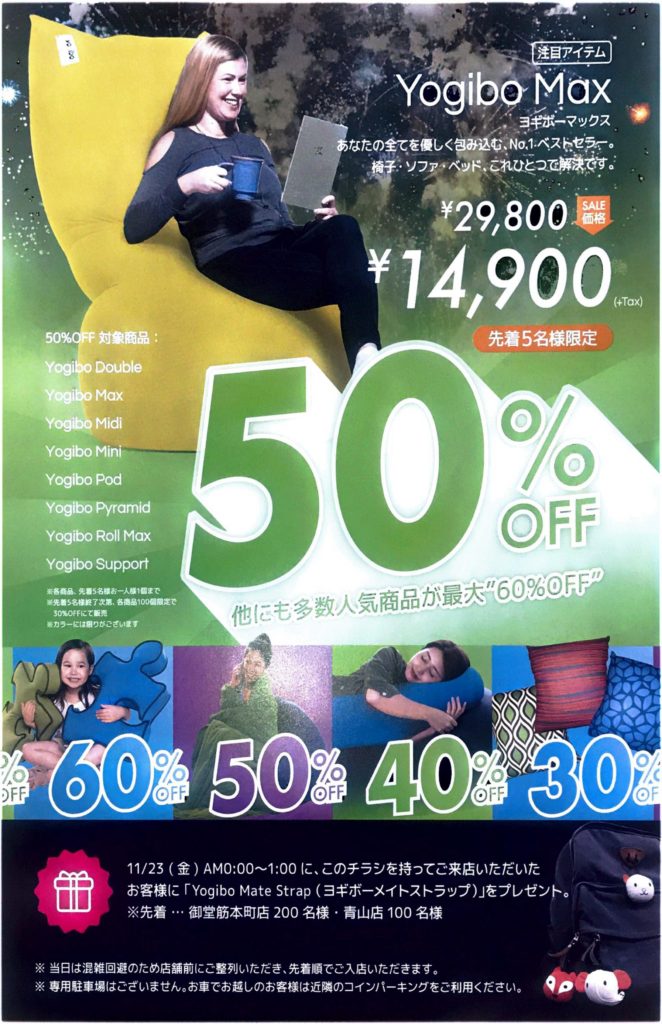 割引率は「60%OFF」。ベストセラー商品 Yogibo Max を含むソファ各種も個数限定で「50%OFF」など各アイテムがYogibo初となる大幅割引が行われます。