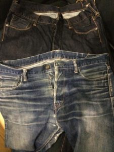 ビフォーアフター。3年履きたおしたKUROのデニム、また同じの買いました。とりあえず乾燥機かけます。3年前は、今は亡き、ときしらずで買ったんよなー。。