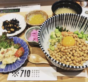 ※710で、「こめなないちぜろ」と読むみたいです。ランチは、健康的な納豆ご飯ランチ専門店みたいで、トッピングをいろいろ選べます。