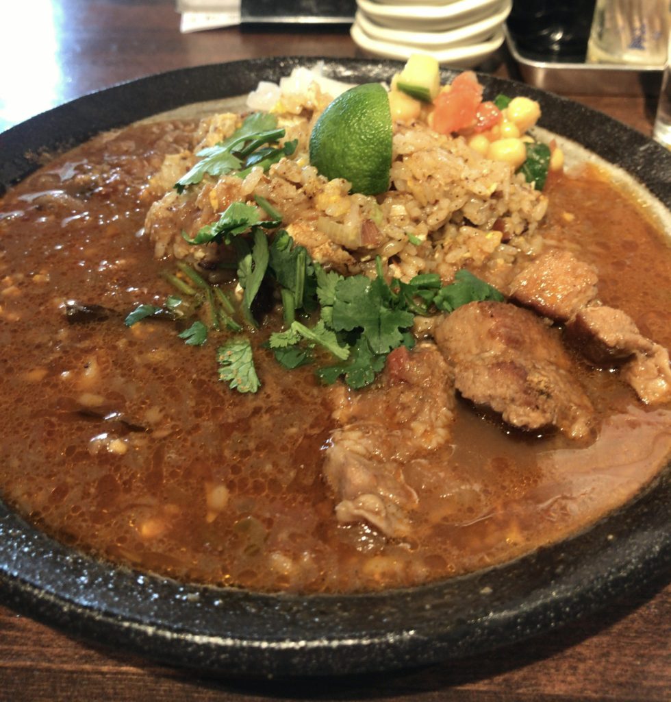 スパイス炒飯と豚バラ入り鶏出汁スープカレーのあいがけです。