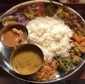 ランチのメニューは、「月と星のダルバート(おかず10種) 1380円、(おかず5種)880円、モモという小籠包みたいなネパール餃子とセットになったモモバートセット1280円と三種類ありましたが、月と星のダルバート(おかず10種)にしました。