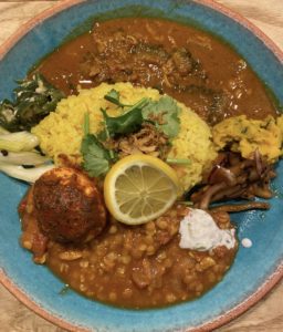 の4種類だったので、「アサリとダルのカレー」「ゴーヤと豚バラのマーラーカレー」の2種あいがけ(1320円)にして、スパイス卵(100円)のトッピング。水菜かパクチーを選べるので、パクチーにしました。大阪のスパイスカレーのあいがけの相場からしたら、ちょっと高いかもしれませんが、美味しくいただきました。