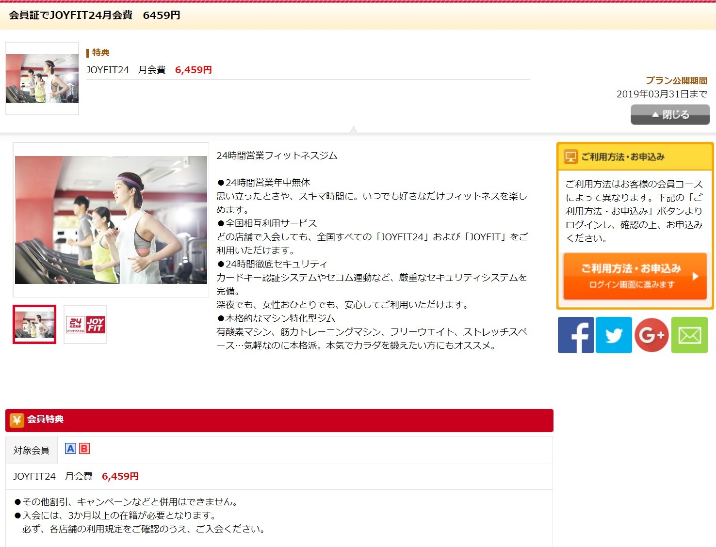 このベネフィットステーションの会員証を見せれば、ジョイフィット24の月会費が割引価格の6,459円(税込)で契約できます。