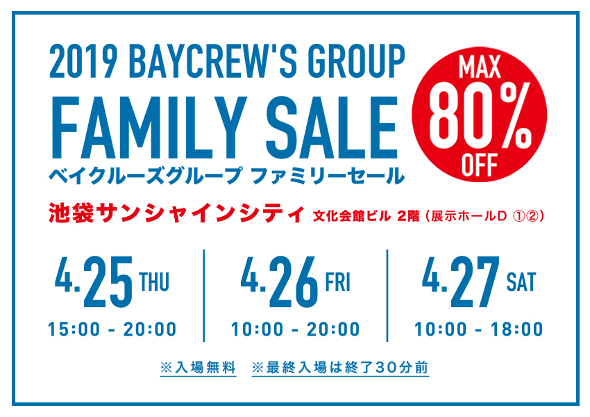 東京 招待状不要 「ベイクルーズ ファミリーセール」2019年4月開催