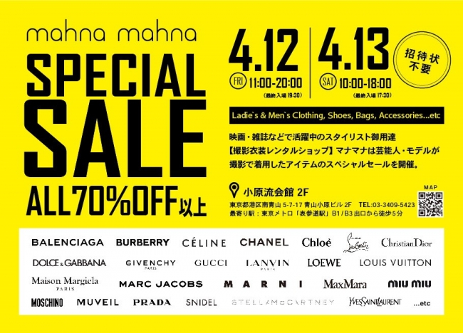 東京 招待状不要 シャネル、ルイ・ヴィトン、エルメス、ディオールなど ブランド品が全部70%以上オフ!!マナマナ ファミリーセール開催
