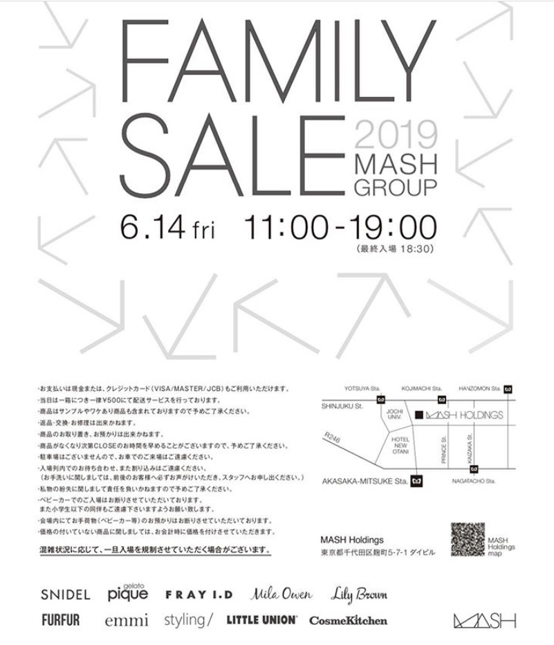 東京 マッシュグループ(スナイデル、ジェラートピケなど展開)ファミリーセール開催 2019年6月14日
