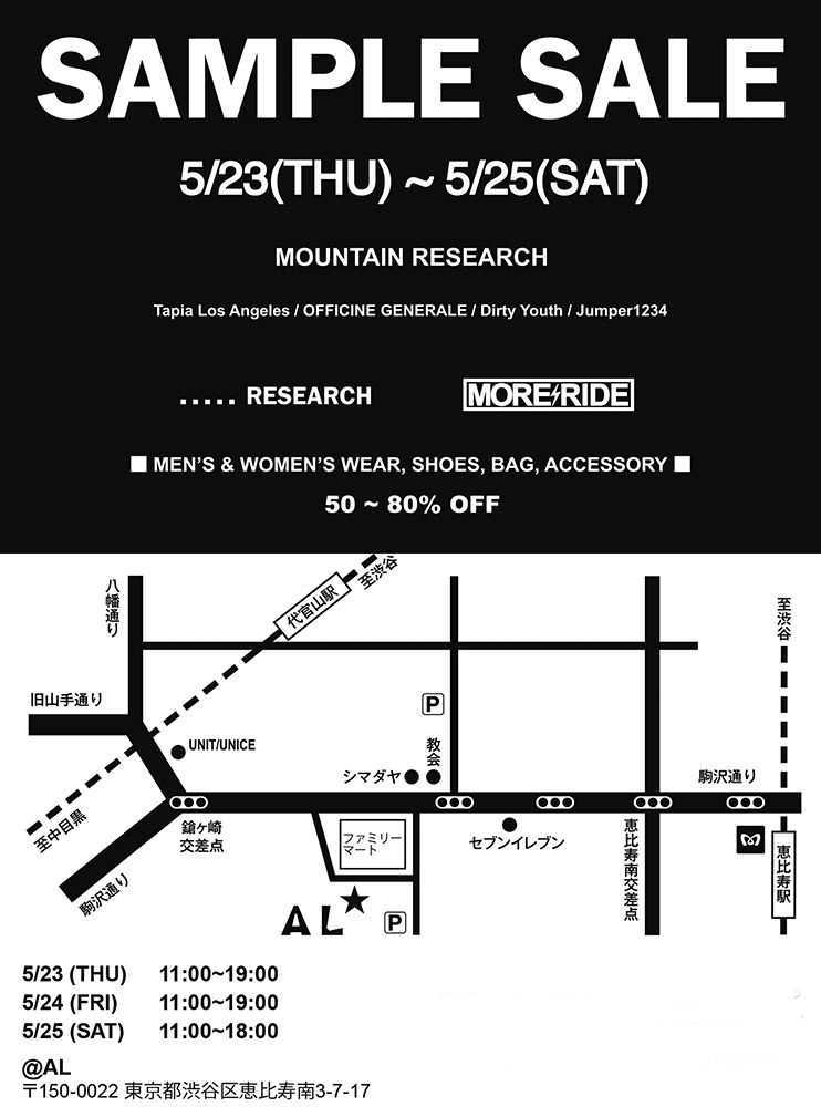 東京 …..RESEARCH / MORE RIDE Sample Sale 2019SS開催 5月23日~25日
