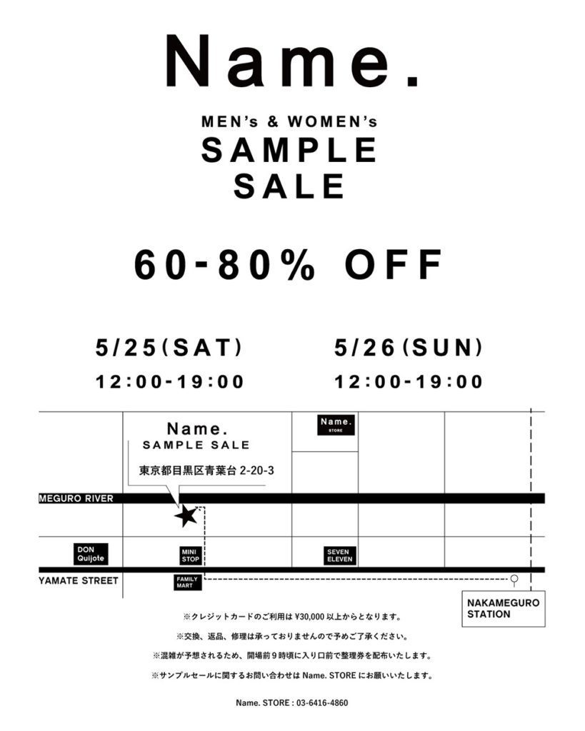 東京 招待状不要 Name.サンプルセール開催 5月25日(土)26日(日)