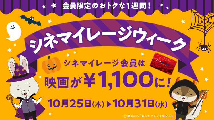 TOHOシネマズで安く映画を見る方法 「シネマイレージウィーク」 シネマイレージ会員なら、10月25日(木)~31日(水)は映画が1,100円!